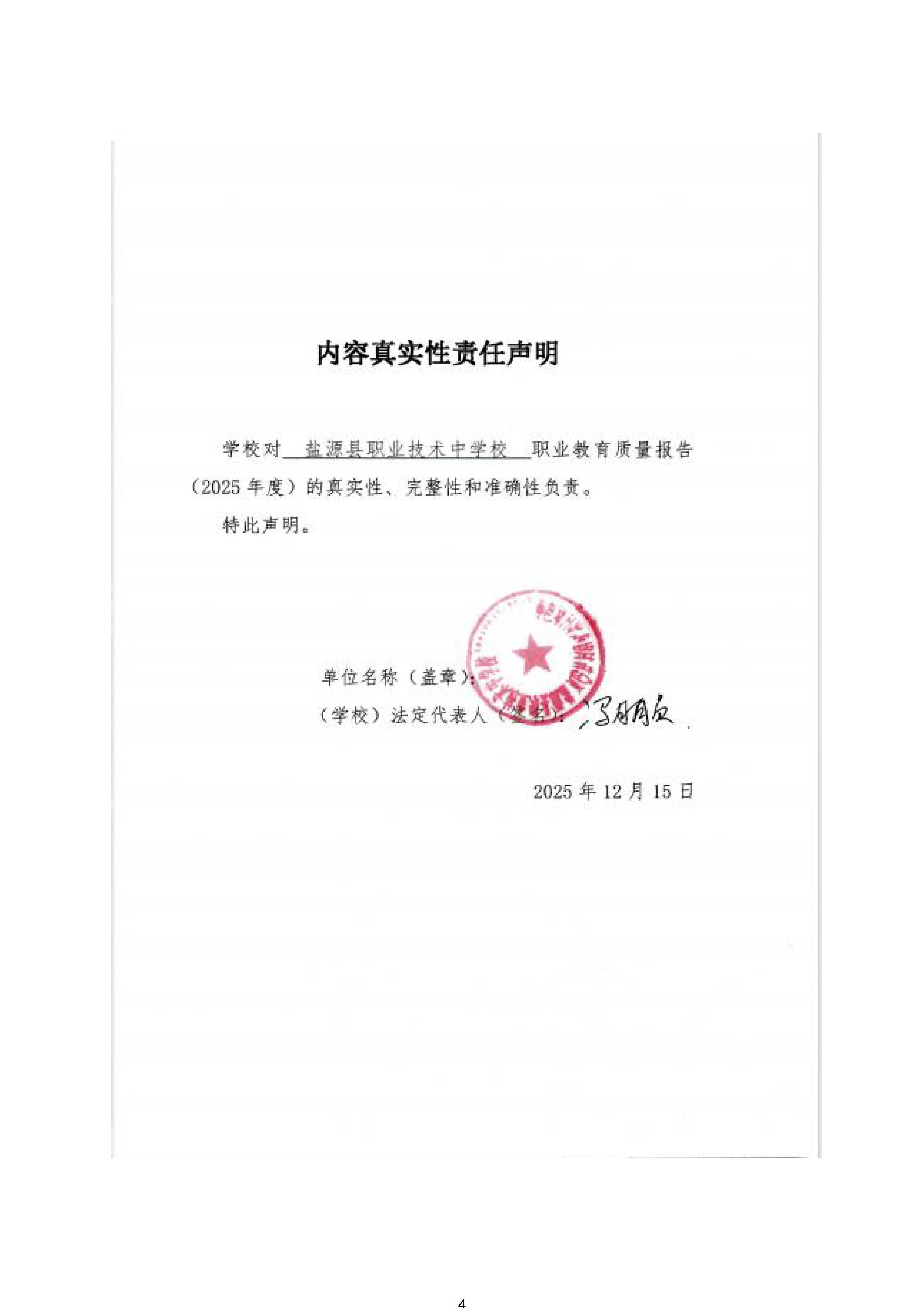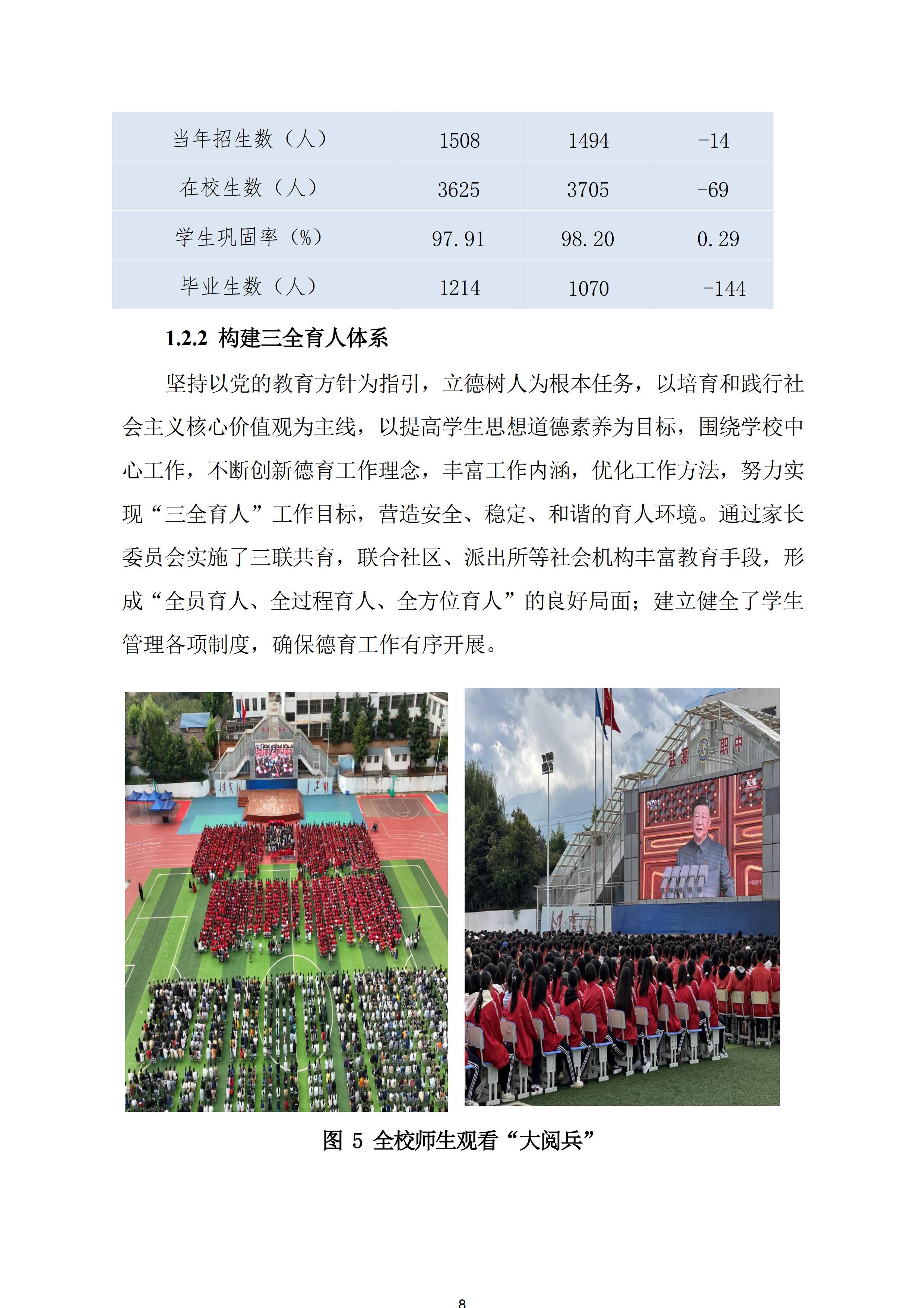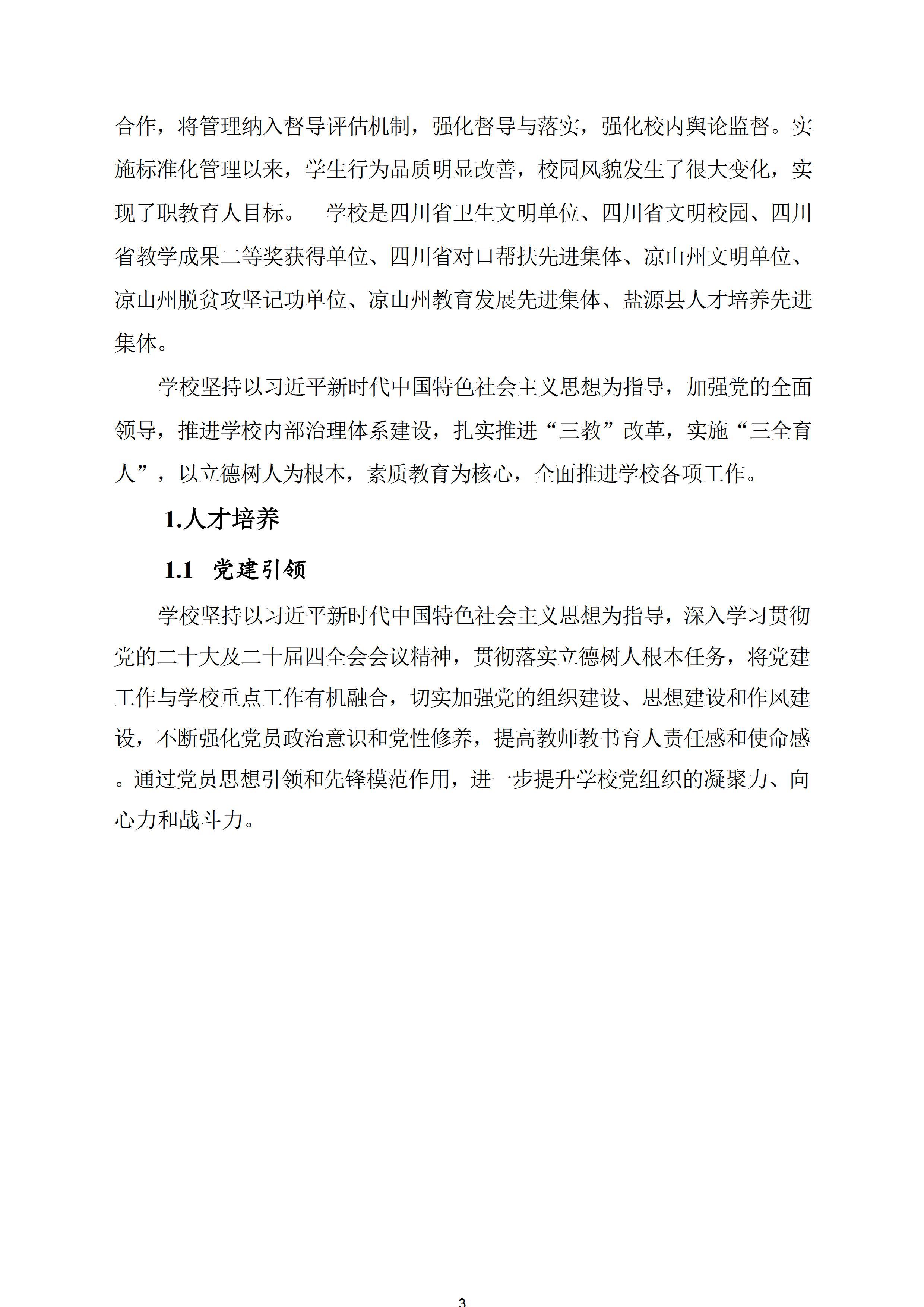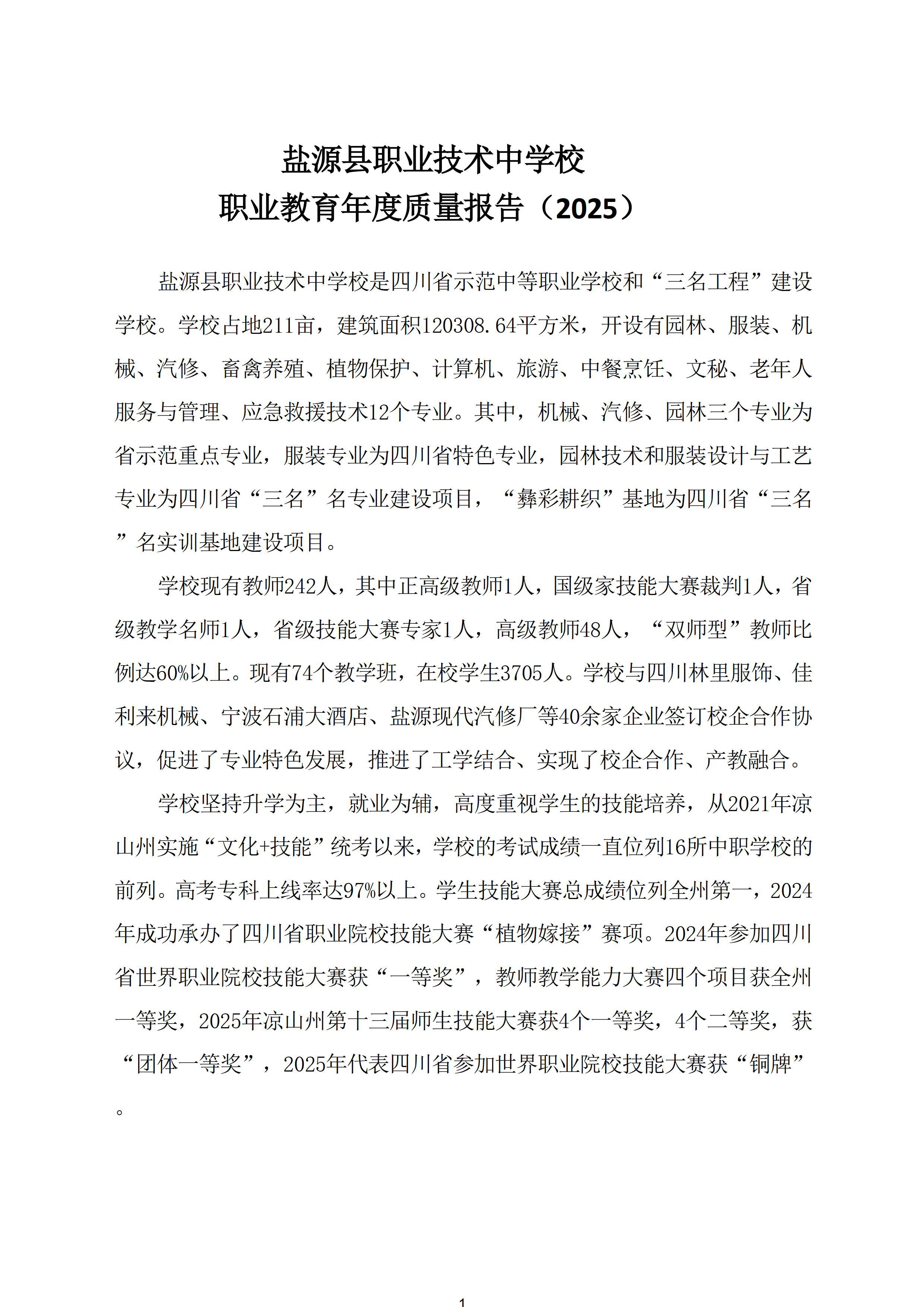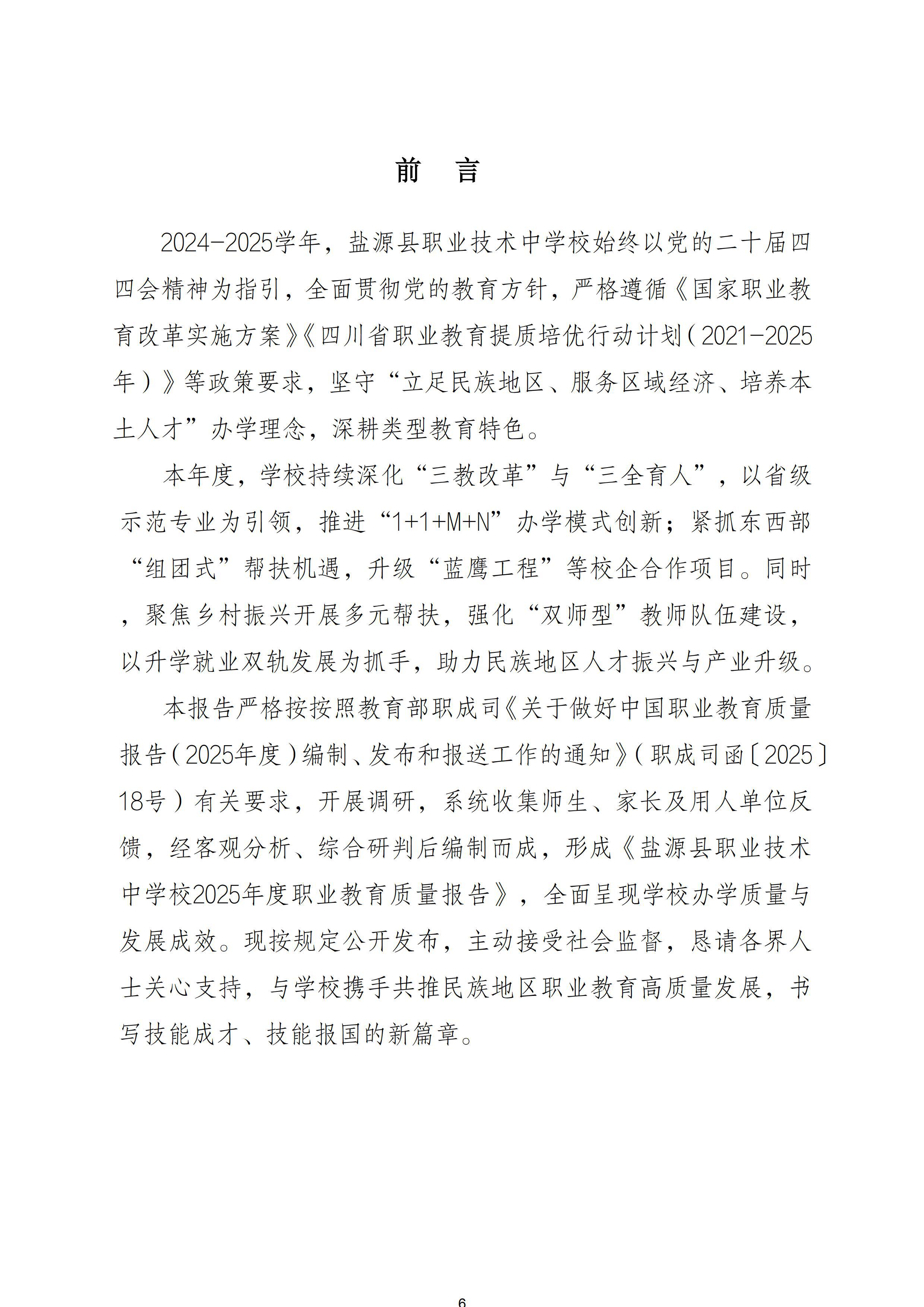 本报告严格按按照教育部职成司《关于做好中国职业教育质量报告(2025年度)编制、发布和报送工作的通知》(职成司函〔2025〕18号)有关要求,开展调研,系统收集师生、家长及用人单位反馈,经客观分析、综合研判后编制而成,形成《盐源县职业技术中学校2025年度职业教育质量报告》,全面呈现学校办学质量与发展成效。现按规定公开发布,主动接受社会监督,恳请各界人士关心支持,与学校携手共推民族地区职业教育高质量发展,书写技能成才、技能报国的新篇章。