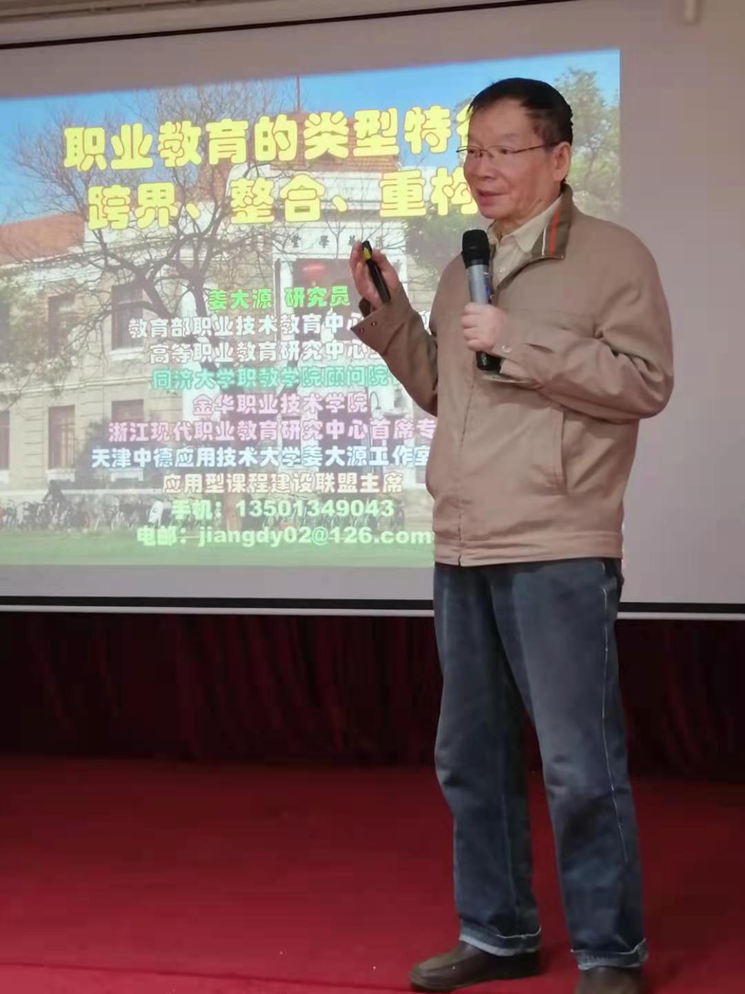 开班典礼之后,江大源教授为大家做了题为《职业教育的类型特征跨界、整合、重构》专题讲座。三个小时的讲座,姜教授从企业与学校联姻的跨界合作;产业与教育链接的需求整合;共性与个性并蓄的框架重构三个大点给参培教师做了详细的解读。教授的讲授生活活泼、娓娓道来,学员听得如痴如醉、受益匪浅。
