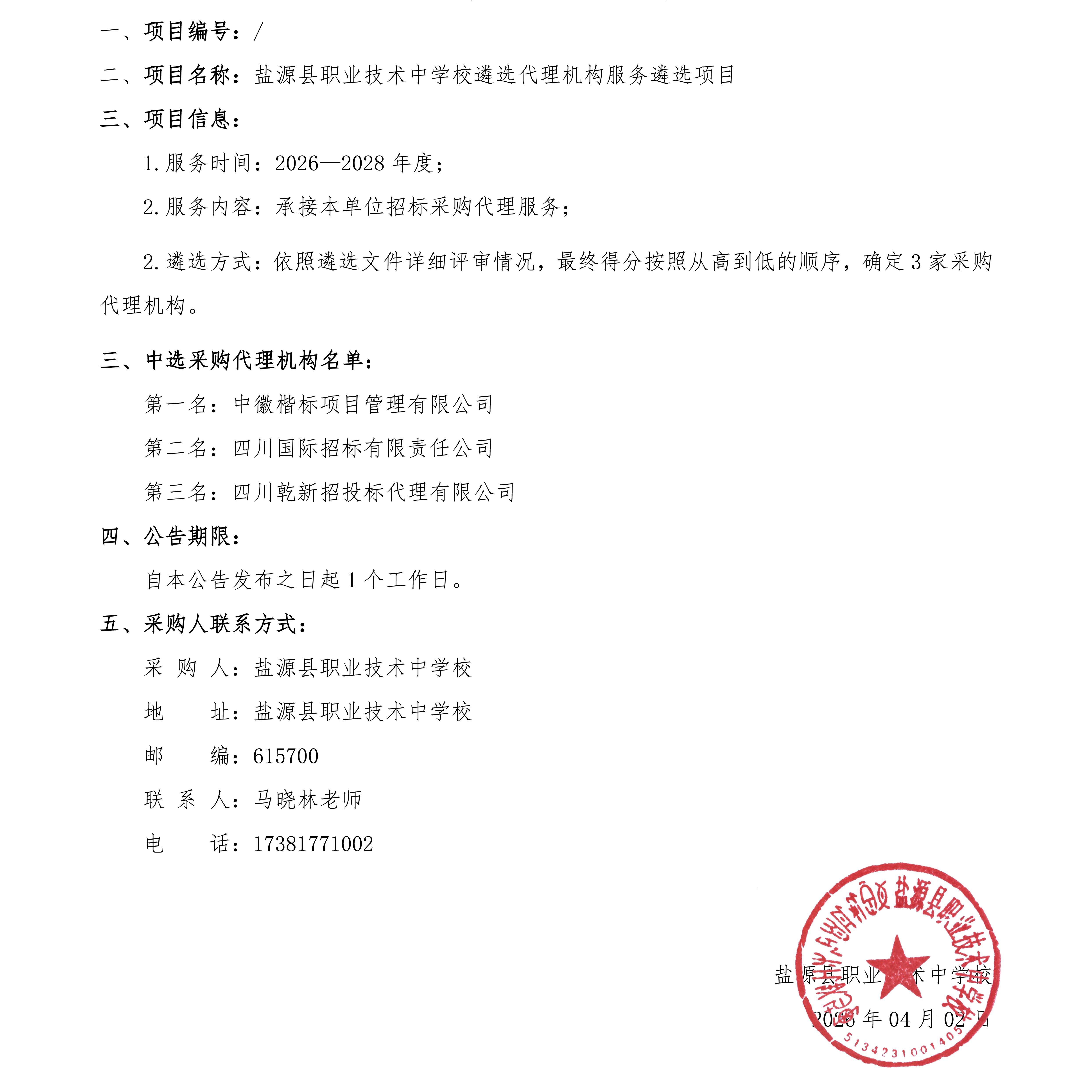遴选代理机构服务遴选项目结果公告